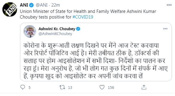 अश्विनी कुमार चौबे ने ट्विटर पर लिखा कि कोरोना के शुरूआती लक्षण दिखने पर मैंने आज टेस्ट करवाया और रिपोर्ट पॉजिटिव आई है. मेरी तबीयत ठीक है, डॉक्टर्स की सलाह पर होम आइसोलेशन में सभी दिशा-निर्देशों का पालन कर रहा हूं. मेरा अनुरोध है, जो भी लोग गत कुछ दिनों में संपर्क में आए हैं, कृपया खुद को आइसोलेट कर अपनी जांच करवा लें.