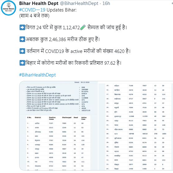 आपको बता दें कि विगत 24 घंटे में कुल 1,12,472 टेस्ट सैंपल की जांच हुई है. अबतक कुल 2,46,389 मरीज ठीक हुए हैं. वर्तमान में कोविड-19 के एक्टिव मरीजों की संख्या 4,620 है. बिहार में कोरोना मरीजों का रिकवरी प्रतिशत 97.62 है. राज्य में अबतक 1,393 लोगों की मौत हो चुकी है.