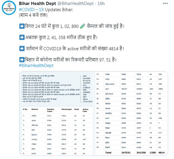 आपको बता दें कि विगत 24 घंटे में कुल 1,02,890 टेस्ट सैंपल की जांच हुई है. अबतक कुल 2,41,358 मरीज ठीक हुए हैं. वर्तमान में कोविड-19 के एक्टिव मरीजों की संख्या 4,814 है. बिहार में कोरोना मरीजों का रिकवरी प्रतिशत 97. 51 है. राज्य में अब तक 1,358 लोगों की मौत हो चुकी है.