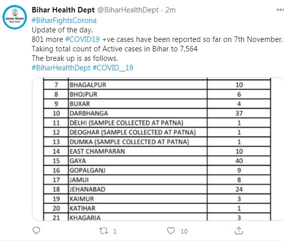 स्वास्थ्य विभाग के मुताबिक, आज अररिया 21, अरवल तीन, औरंगाबाद 11, बांका 11, बेगूसराय 23, भोजपुर छह, बक्सर चार, भागलपुर 10, दरभंगा 37, पूर्वी चंपारण 10, गया 40, गोपालगंज नौ, जमुई आठ, जहानाबाद 24, कैमूर तीन, कटिहार एक, खगड़िया तीन, लखीसराय आठ, मधेपुरा 11, मधुबनी 14, मुंगेर चार, मुजफ्फरपुर 36, नालंदा 52, नवादा 21, पटना 311, पूर्णिया 15, रोहतास पांच, सहरसा 21, समस्तीपुर पांच, सारण 18, शेखपुरा छह, शिवहर पांच, सीतामढ़ी चार, सीवान 19, सुपौल सात, वैशाली नौ और पश्चिम चंपारण से तीन मरीज मिले हैं.
