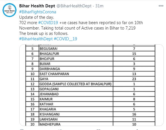 द एचडी न्यूज डेस्क : बिहार में कोरोना वायरस का कहर जारी है. बुधवार को एक साथ 702 नए मरीज मिलने की खबर आ रही है. राज्य में संक्रमितों की संख्या 2,25,047 हो गई है. राजधानी पटना में 194 नए मरीज मिले हैं. स्वास्थ्य विभाग ने ट्वीट कर इसकी जानकारी दी. बिहार में एक्टिव मरीजों की संख्या 7,219 हो गई है.