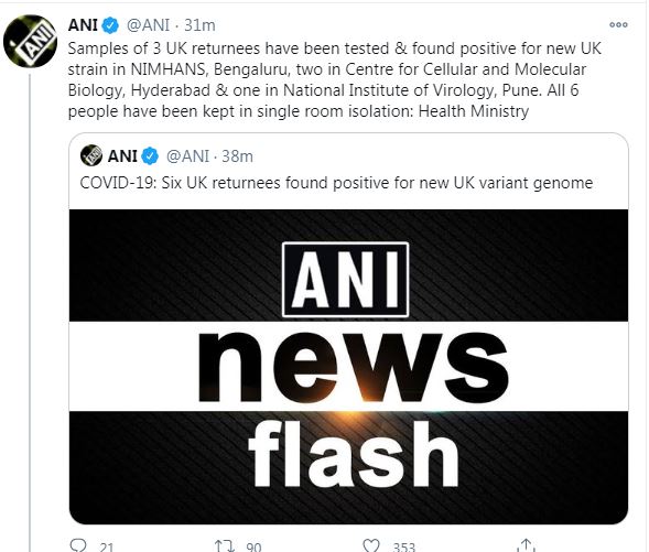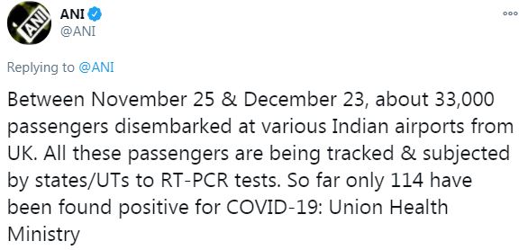 जानकारी के मुताबिक, 25 नवंबर से 23 दिसंबर तक यूके से करीब 33 हजार लोग वापस आए. सभी को ट्रैक किया गया और उनका टेस्ट करवाया गया. इनमें से कुल 114 लोग कोरोना पॉजिटिव निकले थे. जिसके बाद इन सभी के सैंपलों को देश की 10 लैब (कोलकाता, भुवनेश्वर, NIV पुणे, CCS पुणे, CCMB हैदराबाद, CCFD हैदराबाद, InSTEM बेंगलुरु, NIMHANS Bengaluru, IGIB Delhi, NCDC Delhi) में भेजा गया था.